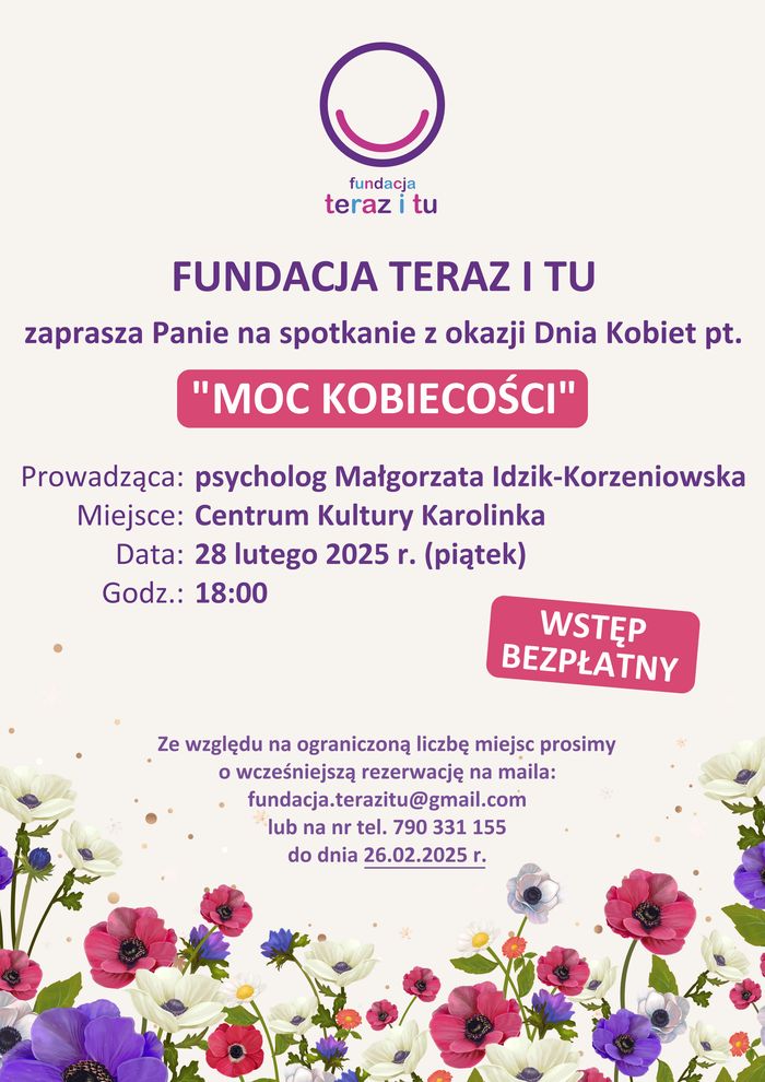 Fundacja Teraz i Tu zaprasza Panie na spotkanie z okazji Dnia Kobiet pt. "Moc kobiecości". Spotkanie odbędzie się w piątek, 28 lutego br. w Centrum Kultury "Karolinka". Szczegóły na plakacie.