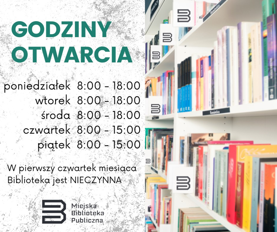 Przypominamy również, że biblioteka jest nieczynna w pierwszy czwartek każdego miesiąca.