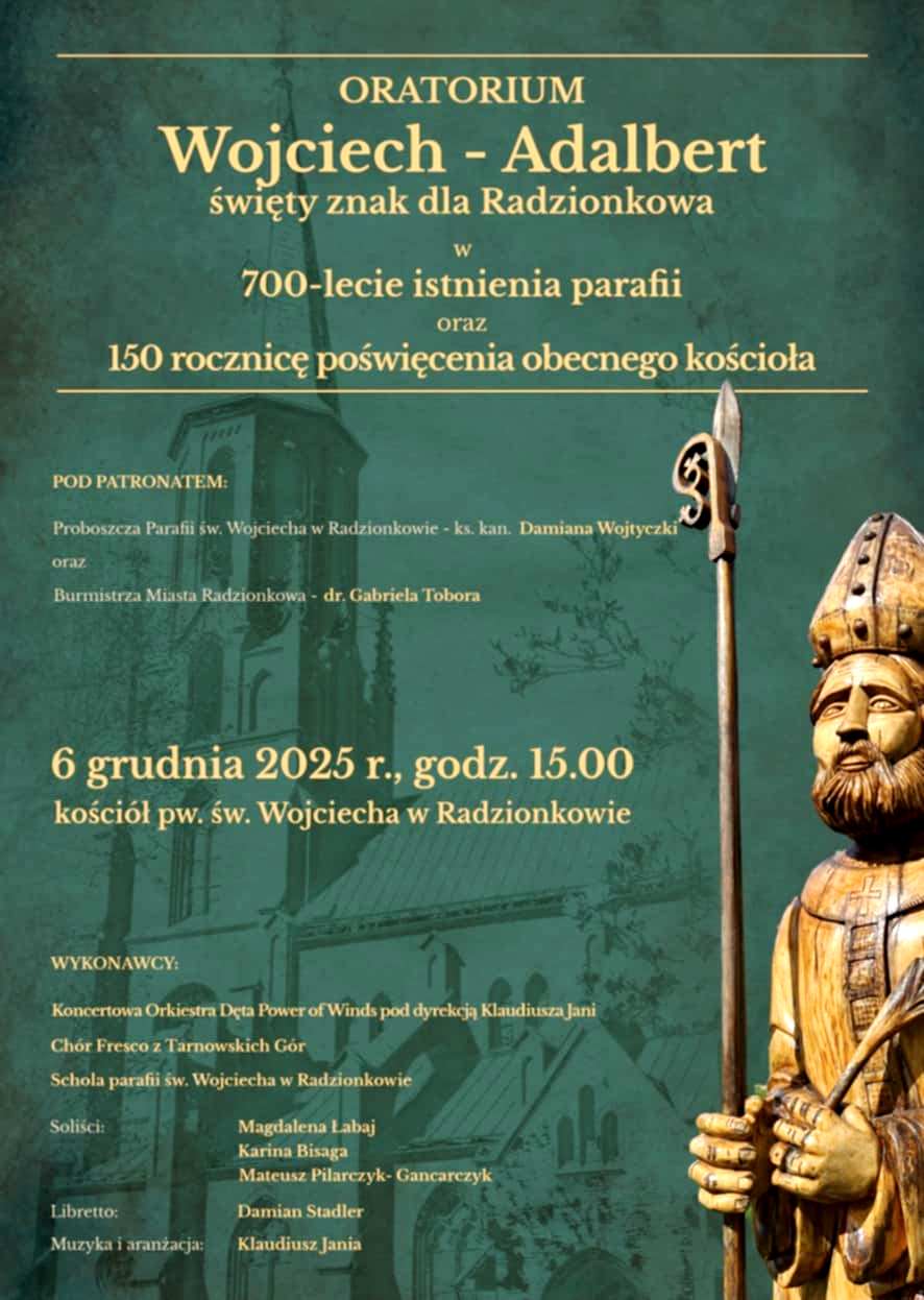W sobotę, 6 grudnia zostanie wykonane oratorium pt.: "Wojciech - Adalbert. Święty znak dla Radzionkowa" z librettem Damiana Stadlera i muzyką Klaudiusza Jani.