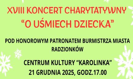 Stowarzyszenie Rodzin Katolickich zaprasza 21 grudnia br. o godz. 17:00 do Centrum Kultury "Karolinka" na XVIII Koncert Charytatywny „O Uśmiech Dziecka”.